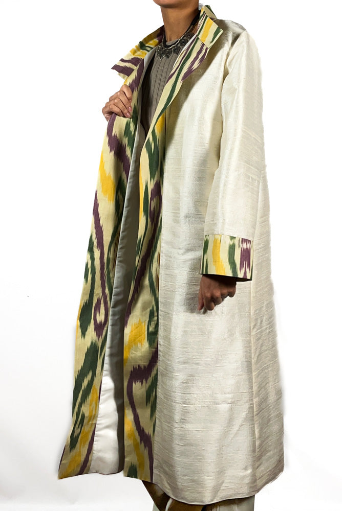 Nos tissus sont chinés par nos soins entre Paris, l'Asie Centrale et le Caucase. Chaque pièce est assemblée et cousue à la main. Tous nos vêtements sont des pièces uniques.